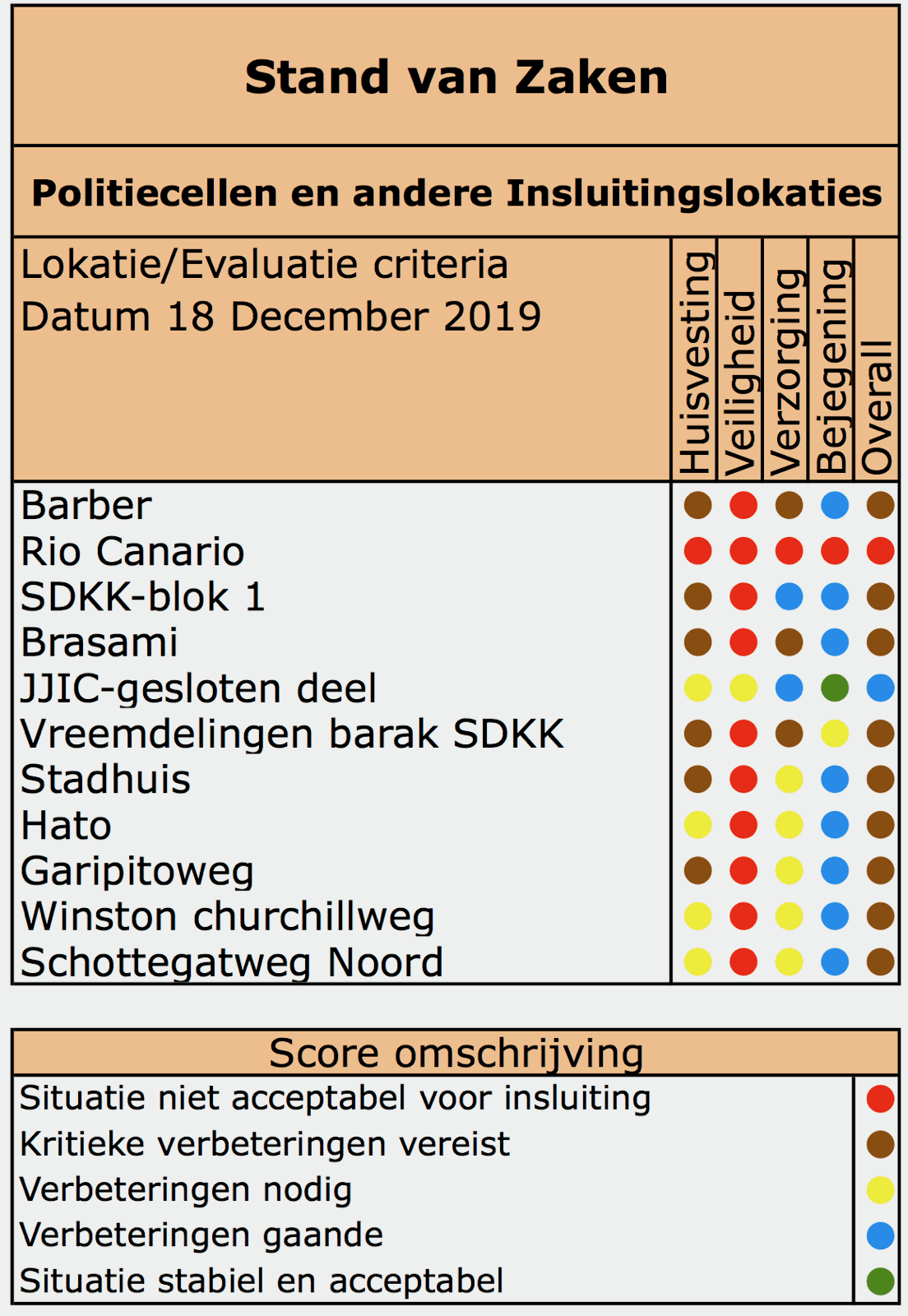 De hier geplaatste dashboard ’Stand van zaken insluiting in Politiecellen, Vreemdelingenbarakken, Brasami, en JJIC’ geeft een globaal overzicht weer van de bevindingen van CTA-CW. De stand van zaken is verdeeld in de hoofdcategorieën: Huisvesting, Veiligheid, Verzorging en Bejegening. De dashboard is gebaseerd op de inspectiebezoeken van CTA-CW. Niet alle resultaten van de inspectiebezoeken kunnen gepubliceerd worden maar hetgeen wel gepubliceerd kan worden is te vinden in de inspectierapporten op deze website. De dashboard zal regelmatig, minimaal om de zes maanden, geüpdate worden om hopelijk verbeteringen aan te geven.
